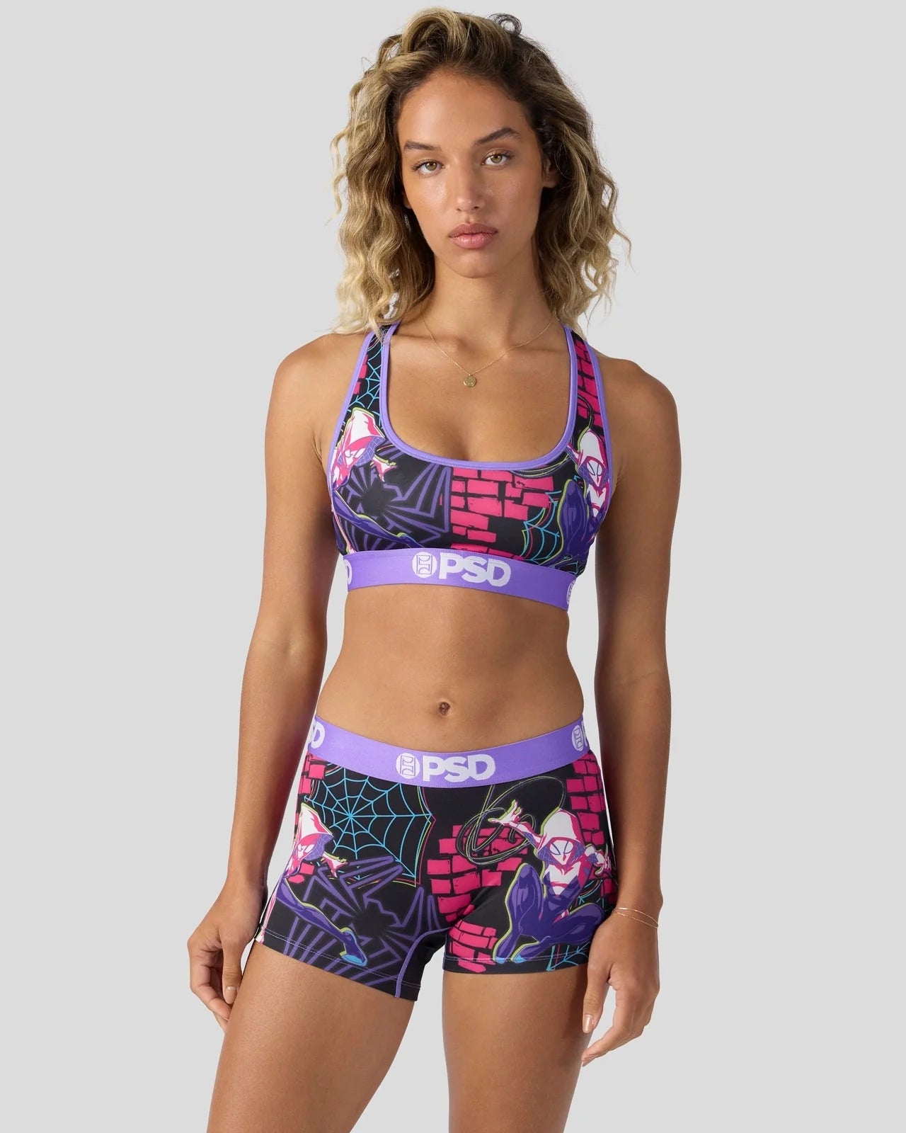 Part spider, all Super Heroine. Swing into action in this new look from Marvel. The Ghost-Spider Pop Sports Bra is made from a silky poly blend and is breathable yet slightly compressive, bringing you the comfort and support you need for everything you get into.