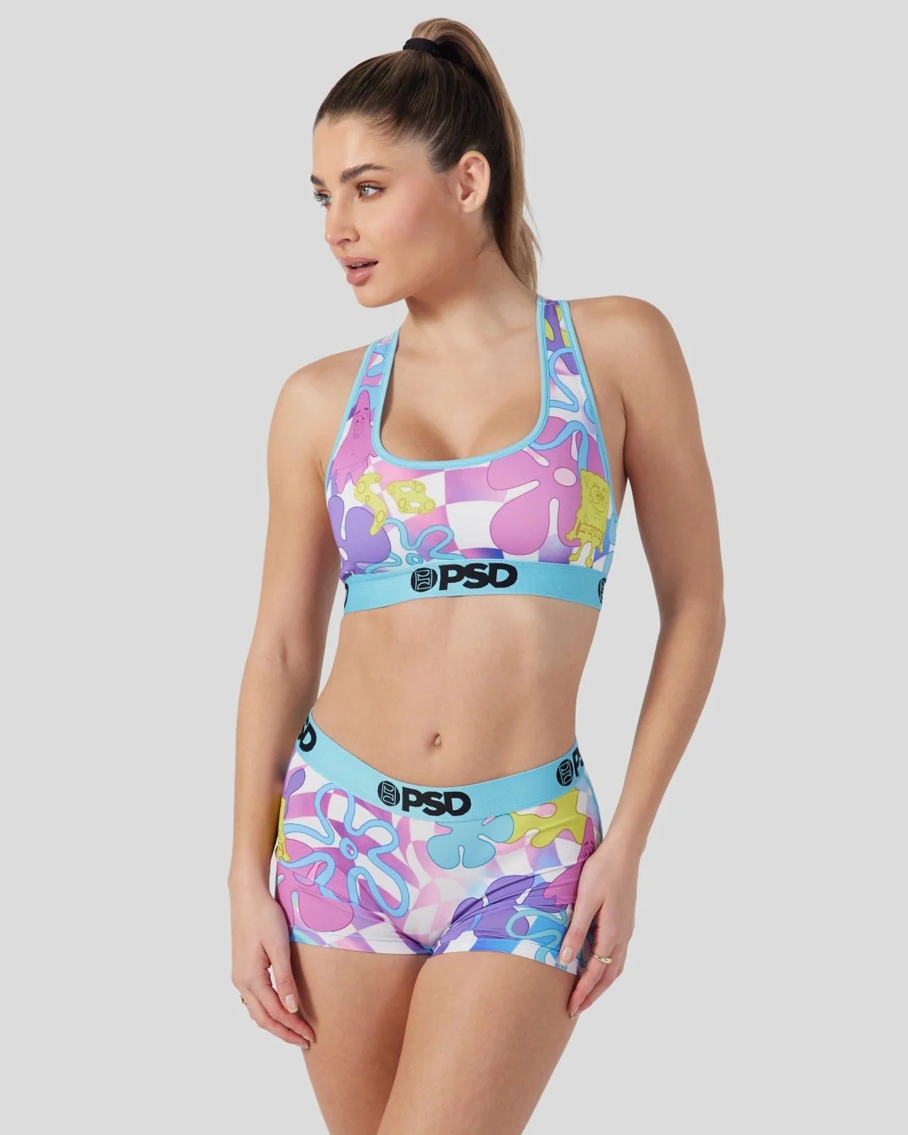 SpongeBob, Patrick, flowers, and checkers all in bright neon colors combine to create a new style you can't miss. The SpongeBob SquarePants Neon Check Sports Bra is made from a silky poly blend and is breathable yet slightly compressive, bringing you the comfort and support you need for everything you get into.